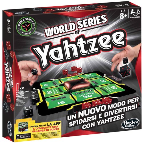 World Series of Yahtzee è una sfida a colpi di dadi veloce, coinvolgente ed emozionante grazie alla sua meccanica mozzafiato, per 2, 3 o 4 giocatori da 8 anni in su. Tutti i giocatori lanciano contemporaneamente i propri 5 dadi, e cercano di realizzare una delle combinazioni rappresentate sulle carte al centro del tabellone. Chi realizza per primo una combinazione può farla propria premendo lo speciale timer elettronico, e da quel momento tutti gli altri avranno pochi secondi per cercare di realizzare un'altra delle combinazioni disponibili. Ma gli amanti del rischio possono anche continuare a lanciare i dadi e cercare di aggiudicarsi la combinazione che vale più punti, tenendo sempre sotto controllo i lanci degli avversari. World Series of Yahtzee offre tante varianti a seconda della strategia dei giocatori, per affrontare ogni volta sfide sempre nuove. E per continuare a divertirti, prova anche la App!