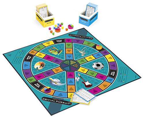 Get everyone playing Trivial Pursuit with cards for kids and adults Fun, familyfriendly trivia is herenow you and the kids can show off your trivia smarts together on family game night The Kids Card questions are just right for younger players, while the Adult Cards challenge older players on their own level The 6 fun questionandanswer categories include People Places, Entertainment, Wild Card, Science Nature, Sports Leisure and History Includes a game board, 300 questionandanswer cards, 2 card holders, 6 scoring tokens, 36 scoring wedges, die and instructions Manufacturer's Suggested Age: 8 Years and Up Number of Players: 2 or More Players
