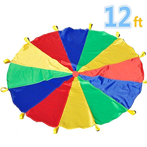 Parachute size: 12-feet diameter, 12 separate handles spaced evenly around for group play(Teach turn-taking and cooperation),Promotes cooperative group play while helping to build muscles,Encourages cooperative play while building upper-body strength,Reinforced mesh center allows ample airflow,Great at birthday parties and picnics(indoor or outdoor play),High-quality, durable 210T polyester taffeta fabric with reinforced web handles, Includes carry bag