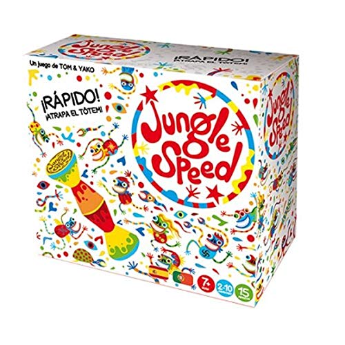 Jungle Speed es el juego de mesa ideal en prácticamente cualquier momento, cualquier lugar y con cualquier grupo de amigos. Su sencillez de reglas lo hace apto para todas las edades. En tan solo un par de minutos se le puede explicar las reglas a un grupo de gente y empezar a jugar de inmediato, no requiere largas explicaciones que pueden hacer que la gente se aburra antes de empezar la partida. El único problema que encontrarán los jugadores nóveles es que, en caso de jugar con gente experta en el juego, tal vez necesite 4 o 5 partidas para empezar a jugar al mismo nivel, ya que la mente debe acostumbrarse a identificar las cartas de un simple vistazo. ¡Pero esto tampoco es ningún problema! Las partidas duran apenas unos minutos y el juego es tan adictivo que no querrán dejarlo. El juego consiste en unas cartas con dibujos variados que los jugadores van sacando por turnos y el objetivo es quedarse sin cartas. Si el dibujo de dos jugadores coincide, deben coger el Tótem, un palo de madera incluido en el juego, que se encontrará en el centro de la mesa. El más rápido le dará su mazo de cartas jugadas al jugador más lento y para complicarlo un poco, también encontraremos una serie de cartas especiales que crearán situaciones que harán variar las reglas. Pese a su corta duración, este juego de mesa no se vuelve un juego aburrido, ya que su punto fuerte está en que es un juego en el que los reflejos y la rapidez mental para identificar las cartas crea una especie de subida de adrenalina que engancha al grupo de jugadores y podrán pasarse horas jugando sin parar. No es el típico juego que juegas un par de partidas y lo guardas en un cajón durante semanas, podrás jugarlo habitualmente, de hecho, la dificultad radica en ¡poder dejar de jugarlo! Siempre quieres una partida más antes de guardarlo. Ideal para niños, si son muy jóvenes pueden quitarse las cartas especiales o las cartas más similares entre sí para simplificarlo.