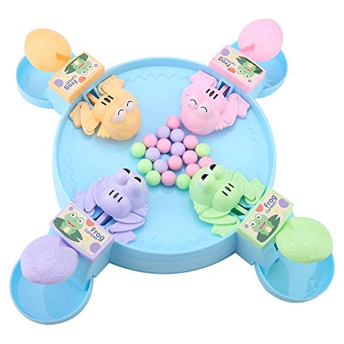 Fits for anyone: This toy supports four people playing at the same time.,Easy to play: Push the button and the frog take action quickly. Release the button and the frog retracts quickly. There are small trays to store your loot!,Push the button and the frog take action quickly. Release the button and the frog retracts quickly. There are small trays to store your loot!,Colorful balls enhance children's perception of color and more color cognition.,Rush to win! Who can gobble the most balls with their hungry frog.